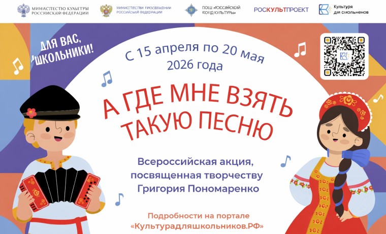 С 15 апреля по 20 мая 2026 года в рамках межведомственного культурнообразовательного проекта «Культура для школьников» пройдет всероссийская акция «А где мне взять такую песню», посвященная творчеству Народного артиста СССР, композитора Григория Пономаренко.